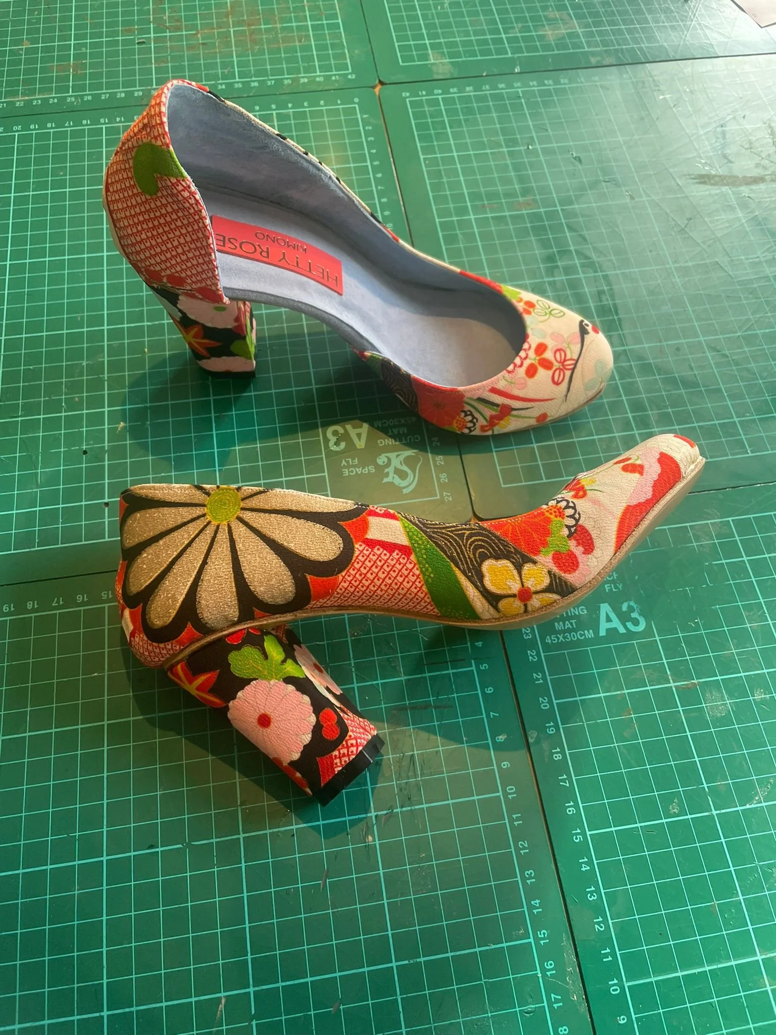 Once the lingerie pieces were underway, the fabric headed back across the Atlantic to Hetty Rose Shoes in the UK. Same fabric, completely different approach. Seeing it transformed into shoes was one of those moments where everything just clicked. Different skills, same idea… let the material lead.